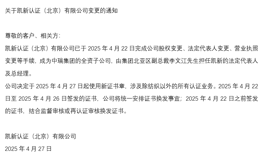 2025.07.02凱新認(rèn)證(北京)有限公司順利通過(guò)ANAB FSSC 22000食品安全體系現(xiàn)場(chǎng)見(jiàn)證評(píng)審凱新認(rèn)證(北京)有限公司(以下簡(jiǎn)稱“凱新認(rèn)證”)成功通過(guò)美國(guó)國(guó)家認(rèn)可委員會(huì)(ANAB)對(duì)FSSC 22000食品安全管理體系的現(xiàn)場(chǎng)見(jiàn)證評(píng)審,并以零不符合的卓越表現(xiàn),彰顯其行業(yè)實(shí)力與專業(yè)水準(zhǔn)。2025.04.27關(guān)于凱新認(rèn)證(北京)有限公司變更的通知尊敬的客戶、相關(guān)方: 凱新認(rèn)證(北京)有限公司已于2025年4月22日完成公司股權(quán)變更、法定代表人變更、營(yíng)業(yè)執(zhí)照變更等手續(xù),成為中瑞集團(tuán)的全資子公司,由集團(tuán)北亞區(qū)副總裁李文江先生擔(dān)任凱新的法定代表人及總經(jīng)理。2025.03.28關(guān)于ISO/IEC 27006-1:2024(CNAS-CC170:2024)認(rèn)證標(biāo)準(zhǔn)換版工作安排的公告國(guó)際標(biāo)準(zhǔn)化組織(ISO)于2024年3月發(fā)布ISO/IEC 27006-1:2024《信息安全、網(wǎng)絡(luò)安全和隱私保護(hù) 信息安全管理體系審核和認(rèn)證機(jī)構(gòu)認(rèn)證機(jī)構(gòu)要求 第1部分:通用》,該標(biāo)準(zhǔn)替代了ISO/IEC 27006:2015及其相應(yīng)的修改單。國(guó)際認(rèn)可論壇(IAF)于2024年5月發(fā)布強(qiáng)制性文件IAF MD29:2024《ISO/IEC 27006-1:2024轉(zhuǎn)換要求》(第1版),提出了本次轉(zhuǎn)換周期,并規(guī)定了IAF成員認(rèn)可和認(rèn)證機(jī)構(gòu)的標(biāo)準(zhǔn)轉(zhuǎn)換要求。2025.02.25關(guān)于凱新認(rèn)證啟用電子證書(shū)的通知為貫徹落實(shí)國(guó)家關(guān)于加快推進(jìn)電子證照擴(kuò)大應(yīng)用領(lǐng)域的相關(guān)政策要求,進(jìn)一步提升認(rèn)證證書(shū)的管理效率,優(yōu)化客戶服務(wù)體驗(yàn),凱新認(rèn)證(北京)有限公司將全面啟用電子證書(shū)?,F(xiàn)將有關(guān)事項(xiàng)通知如下